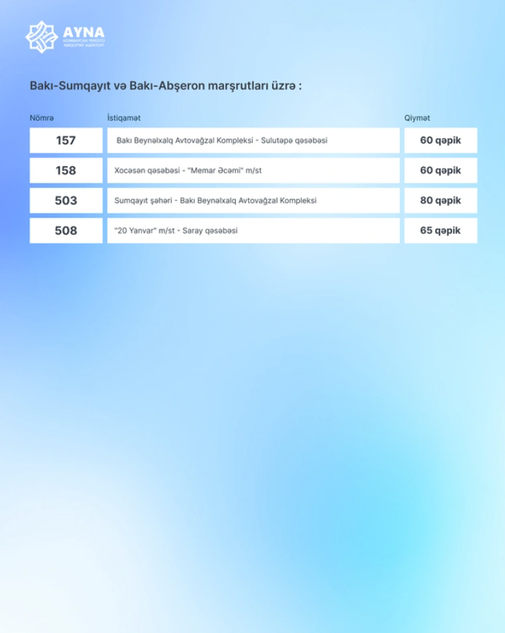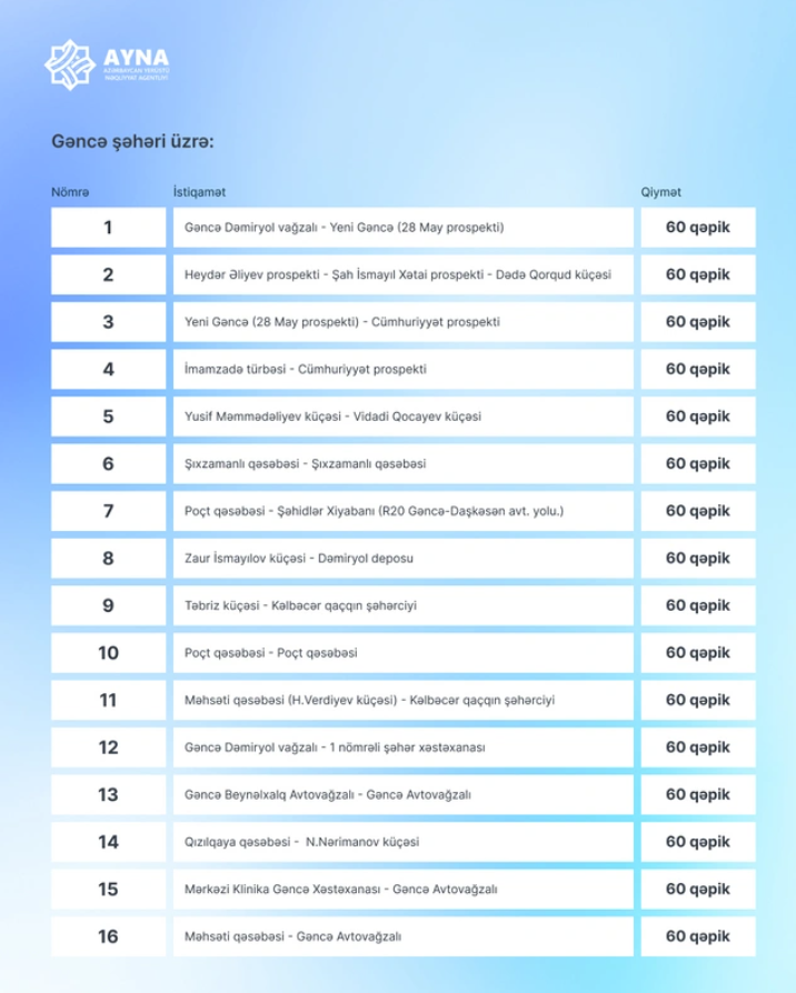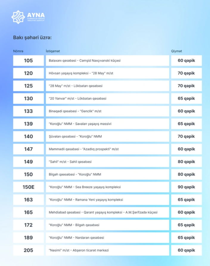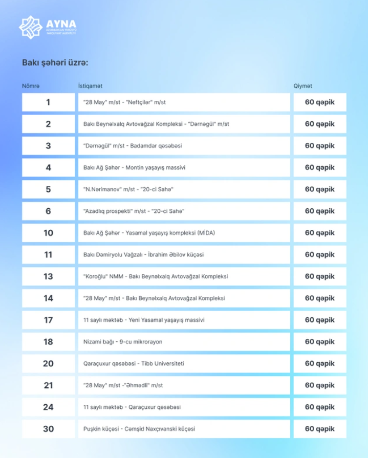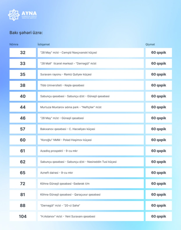 Qeyd edək ki, sentyabrın 29-da Rəqəmsal İnkişaf və Nəqliyyat Nazirliyinin Kollegiyası avtobus marşrutları və metroda sərnişindaşıma üzrə yeni tariflər müəyyən edib. Qərara əsasən, müasir tələblərə cavab verən və yalnız nağdsız ödəniş alətləri vasitəsilə fəaliyyət göstərən müntəzəm şəhərdaxili (rayondaxili), qəsəbələrarası və şəhərətrafı avtobus marşrutlarında sərnişindaşıma xidmətlərinin tariflərinin aşağı həddi (məsafədən asılı olaraq tariflər dəyişir) də 60 qəpik olaraq müəyyən edilib.