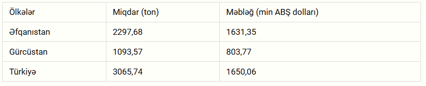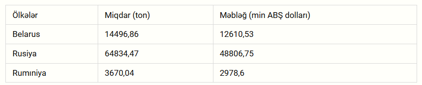Məlumata görə, bu göstərici ötən ilin eyni dövrü ilə müqayisədə həcm ifadəsində 36,1 min ton və ya 1,8 dəfə, dəyər baxımından isə 25,9 milyon ABŞ dolları və ya 1,7 dəfə çoxdur.