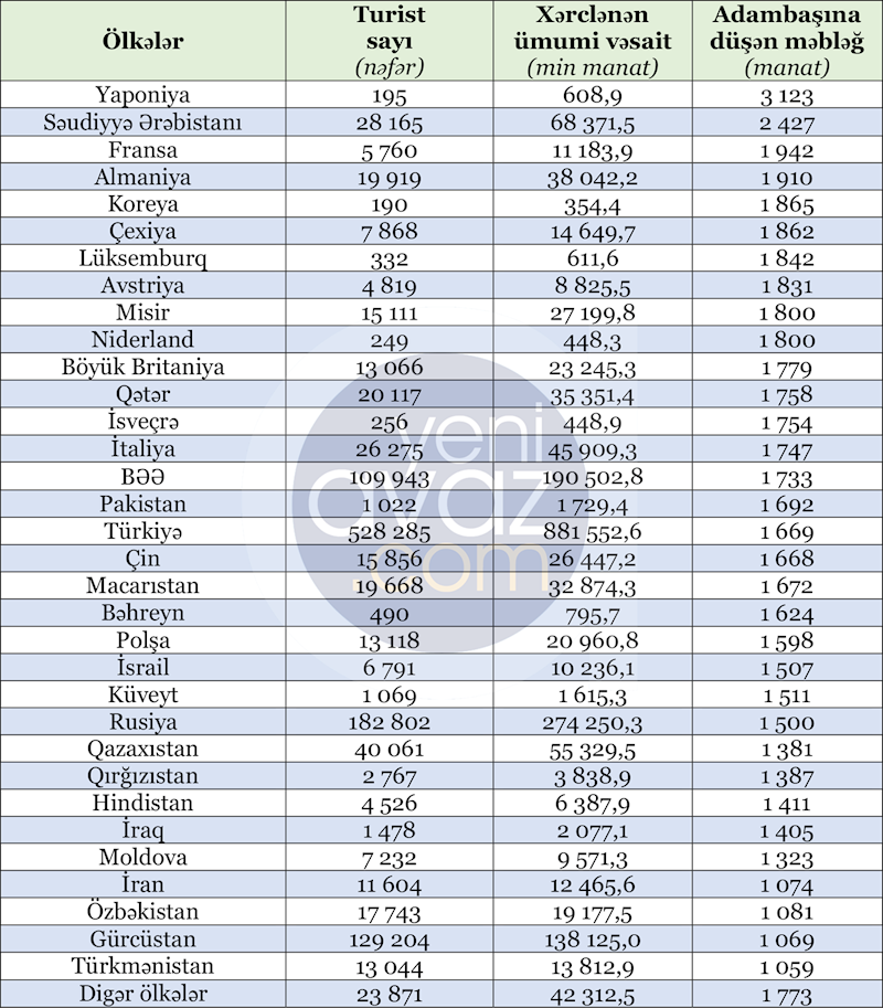 Onu da bildirək ki, Azərbaycandan gedən turistlər ən çox Yaponiyada pul xərcləyiblər. Ötən il Yaponiyaya 195 nəfər azərbaycanlı turist gedib və onların hər biri orta hesabla 3 123 manat xərcləyib. Ən az pul xərcləyənlər isə Türkmənistana səfər edən turistlər olub. Türkmənistana son bir il ərzində 13 min 44 azərbaycanlı turist gedib və onların hər biri 1 059 manat xərcləyib.